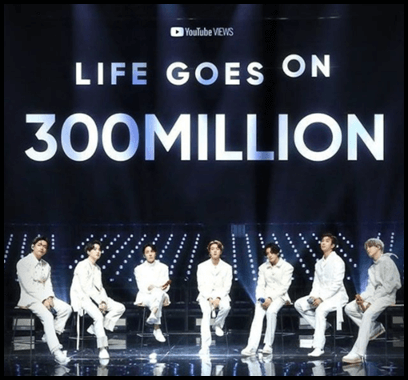방탄소년단(BTS)의 뮤직비디오인 라이프 고즈 온이 유튜브 조회수 3억 뷰를 찍었다고 합니다. 소속사인 빅히트 엔터테인먼트 측은 27일 '방탄소년단이 지난해 11월 발매한 비(BE)의 타이틀곡 라이프 고즈 온(Life Goes On) 뮤직비디오의 유튜브 조회수가 이날 오후 2시 18분경 3억 뷰를 넘겼다며 방탄소년단 통산 15번째 3억 뷰 달성 뮤직비디오가 되었다고 합니다.